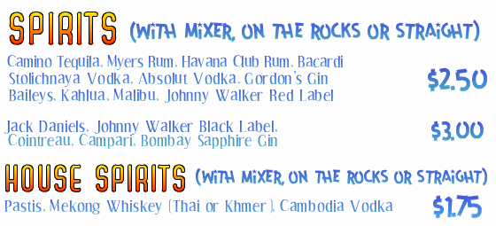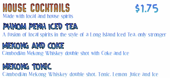 Enjoy quality food, BBQ, mixed drinks, cocktails, cold beer, sandwiches and snacks at reasonable prices as you cruise the Mekong River. We offer tasty food prepared by a professional, clean conditions and safe ice. Please check below for a description of our BBQ Buffet and Khmer Buffet and meal/drink prices.